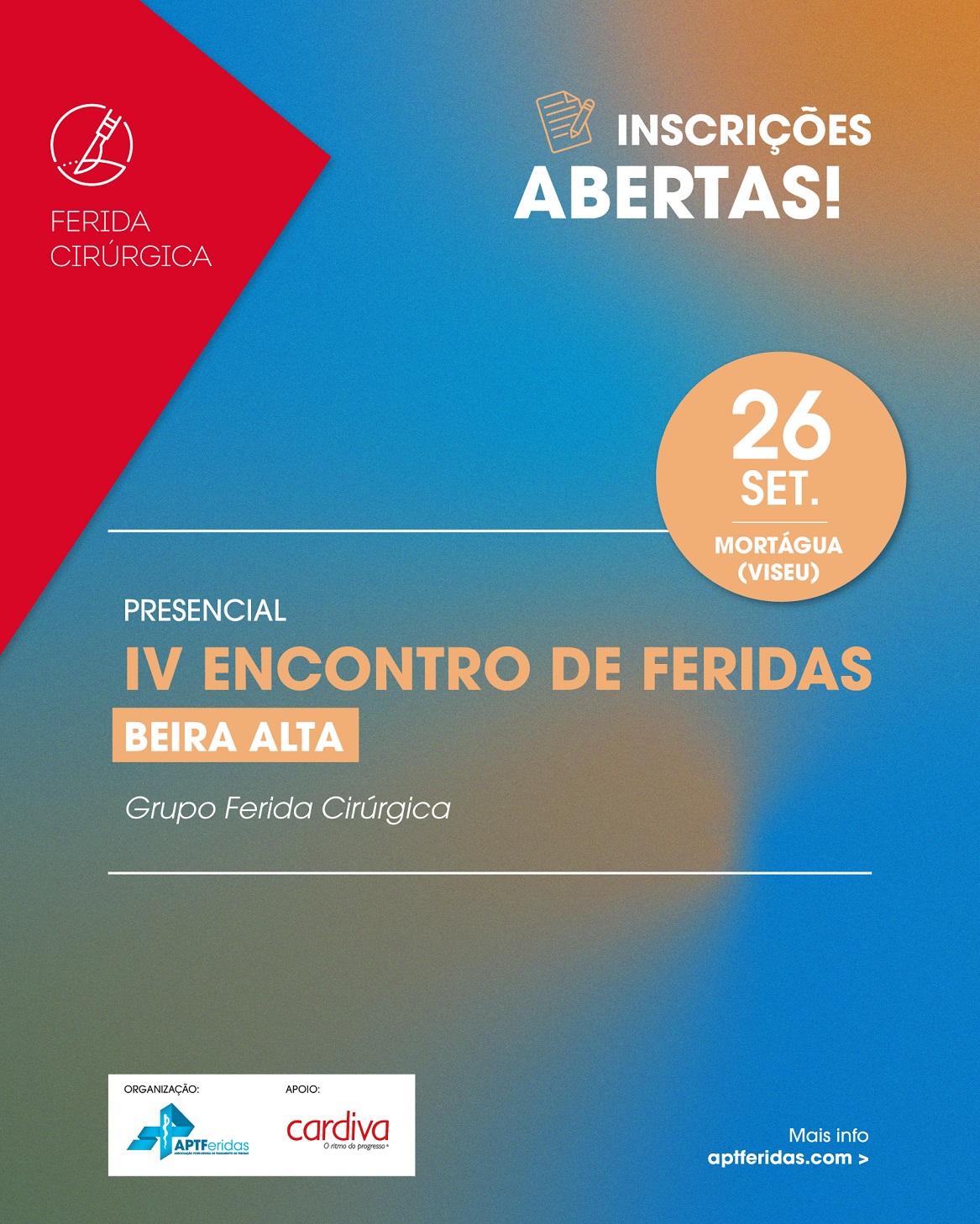 Estão oficialmente abertas as inscrições para o IV Encontro de Feridas da Beira Alta: Ferida Cirúrgica, que se realizará no dia 26 de Setembro de 2025, em Mortágua (distrito de Viseu).