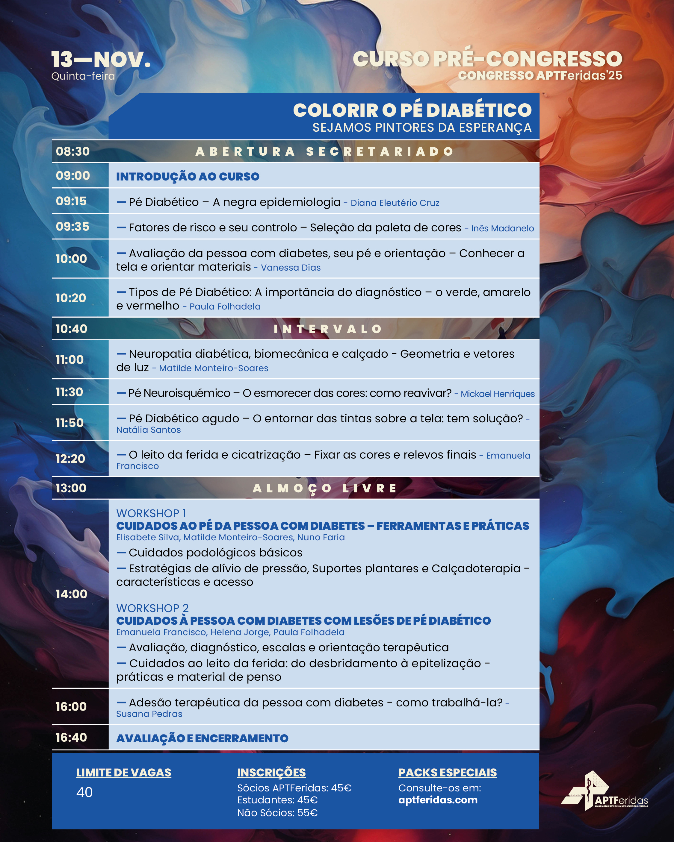 Num cenário onde o Pé Diabético ainda representa um grande desafio na prática clínica, com implicações sérias na morbilidade e qualidade de vida do doente e de quem o rodeia; na sociedade e nos custos em saúde, este Curso inovador convida os profissionais de saúde a assumirem o papel de verdadeiros pintores da esperança.
