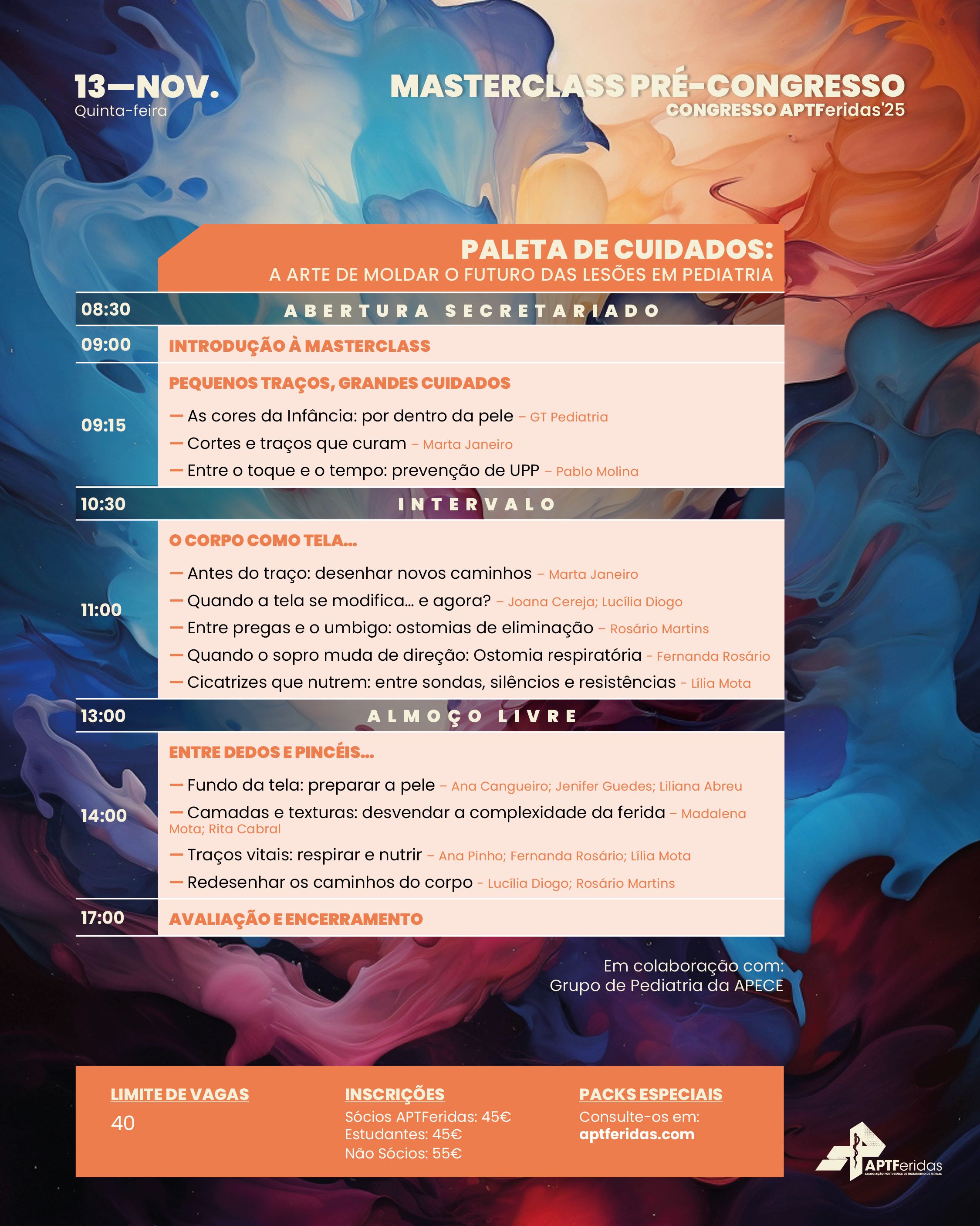 Serão discutidos aspetos Fisiológicos da Pele da Criança, Fatores de Risco para Lesões Cutâneas, de Avaliação e Tratamento de Feridas, bem como estratégias para o Cuidado e Acompanhamento de Crianças Ostomizadas. A Masterclass também abordará o papel essencial da atuação multiprofissional, a importância da comunicação com a Família e os desafios éticos e emocionais envolvidos nesse tipo de assistência.