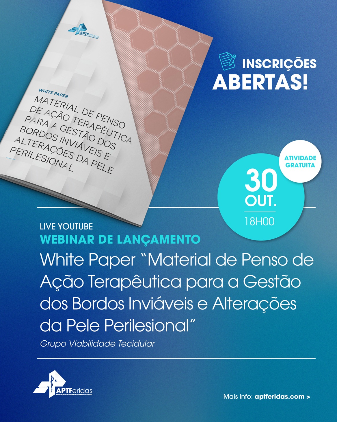 Estão oficialmente abertas as inscrições para o Webinar de Lançamento do WhitePaper "Material de Penso de Ação Terapêutica para a Gestão dos Bordos Inviáveis e Alterações da Pele Perilesional":
