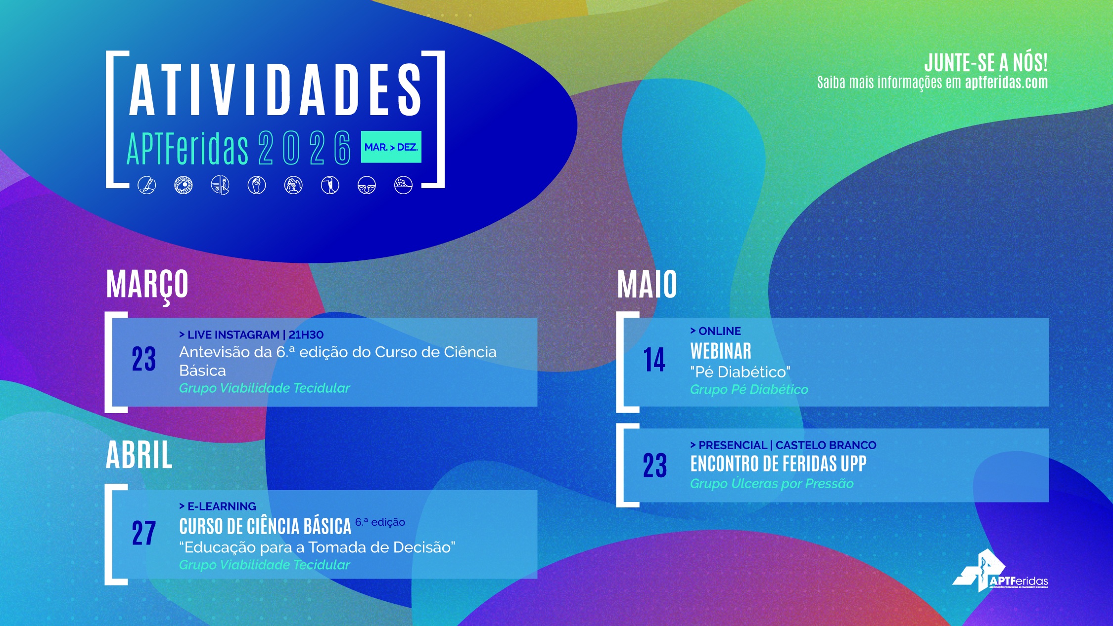 Em 2026 a APTFeridas reforça, uma vez mais, o seu compromisso com a Formação de Excelência e a Produção/Disseminação da melhor e mais robusta Evidência Científica nas áreas da Investigação, Prevenção e Tratamento de Feridas.