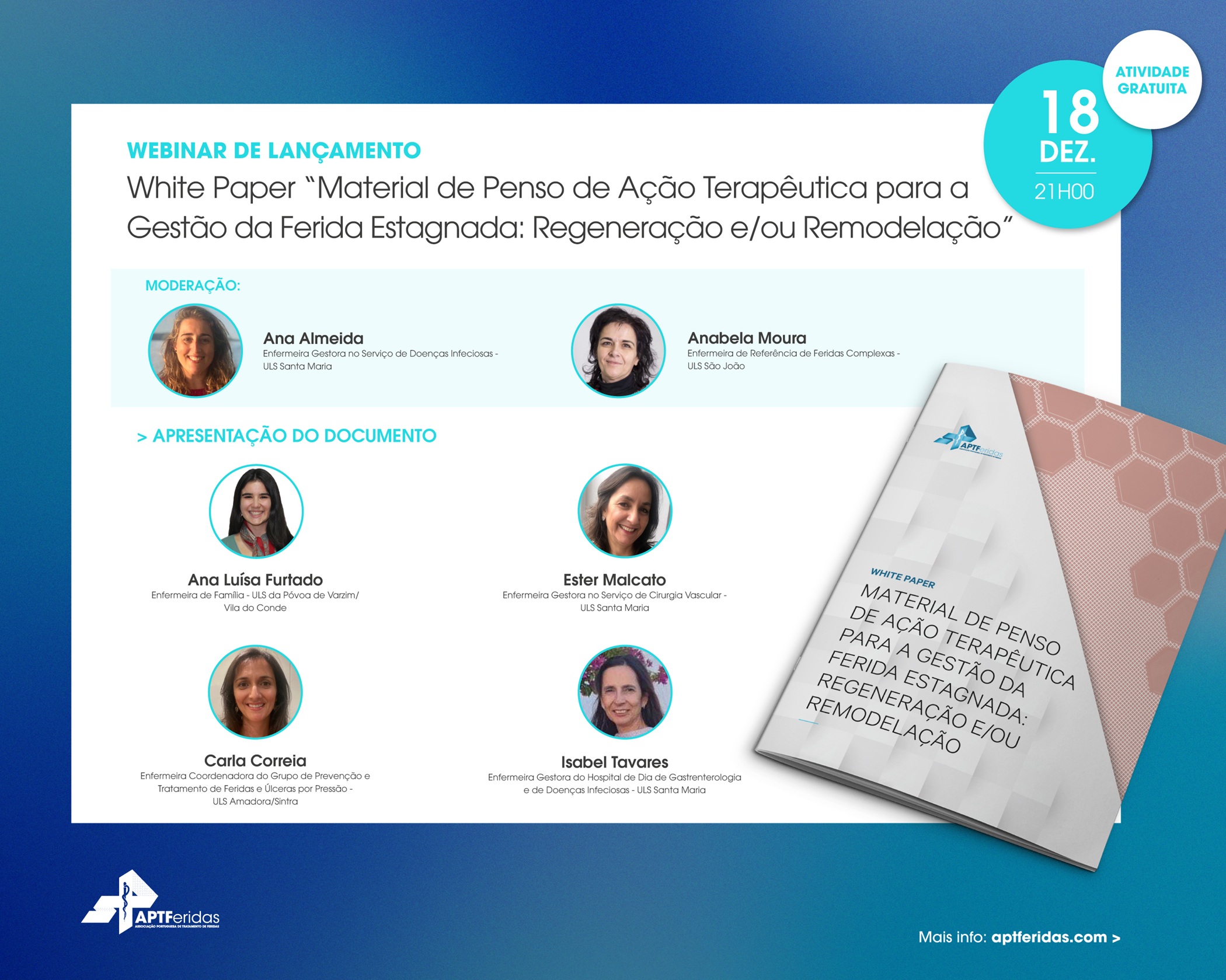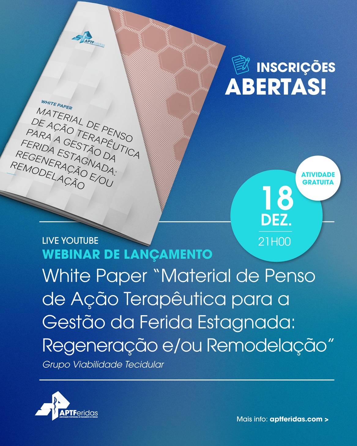 Estão oficialmente abertas as inscrições para o Webinar de Lançamento do WhitePaper "Material de Penso de Ação Terapêutica para a Gestão da Ferida Estagnada: Regeneração e/ou Remodelação":